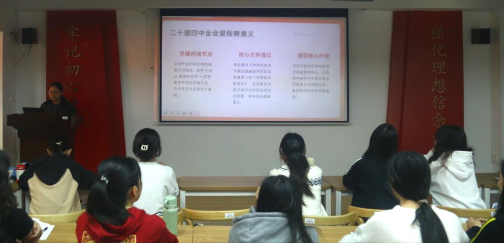理论学习后,师生共同观看介绍全会精神的短视频,直观感受国家发展成就,深刻体悟坚持党的领导是各项事业取得成功的根本保证。在交流环节,学生代表踊跃发言,结合专业学习与生活感悟分享心得。大家普遍认为,此次分享会内容详实、阐释深刻,不仅加深了对国家大政方针和发展战略的理解,更激发了身为新时代青年的责任担当。