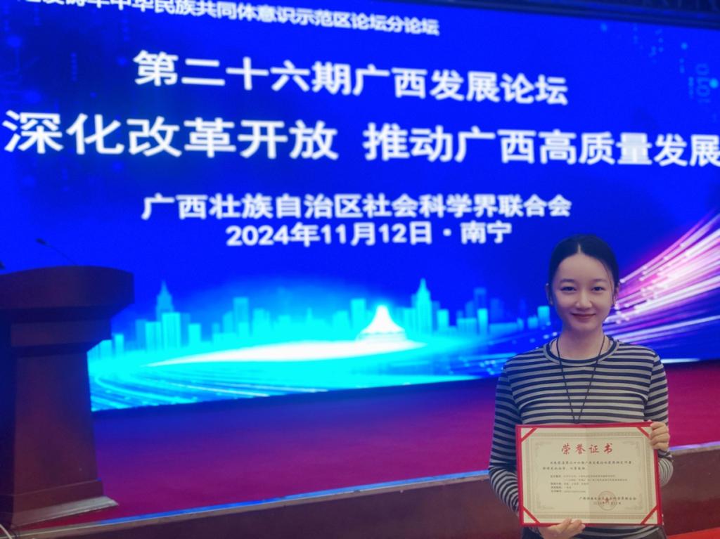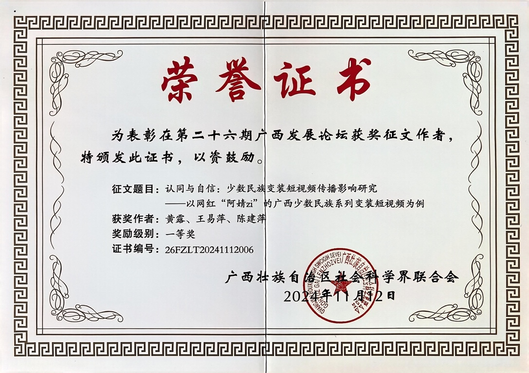 我院教师黄露、王易萍、陈建萍撰写的《认同与自信:少数民族变装短视频传播影响研究——以网红“阿婧zi”的广西少数民族系列变装短视频为例》荣获一等奖。充分展现了我院教师在民族文化传播与中华民族共同体意识构建研究领域的深厚底蕴与卓越贡献。