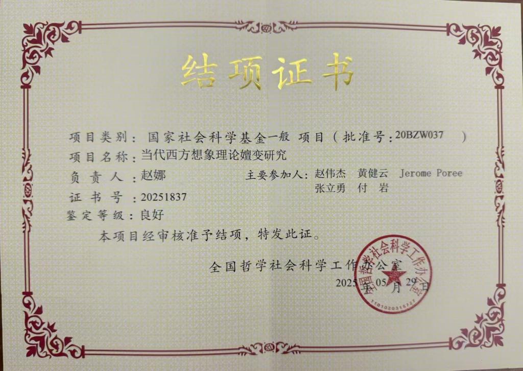本站讯 6月3日,全国哲学社会科学工作办公室发布2025年5月国家社科基金项目结项情况。我院赵娜副教授主持完成的国家社科基金一般项目《当代西方想象理论嬗变研究》一次鉴定通过,以扎实的研究成果荣获“良好”等级。