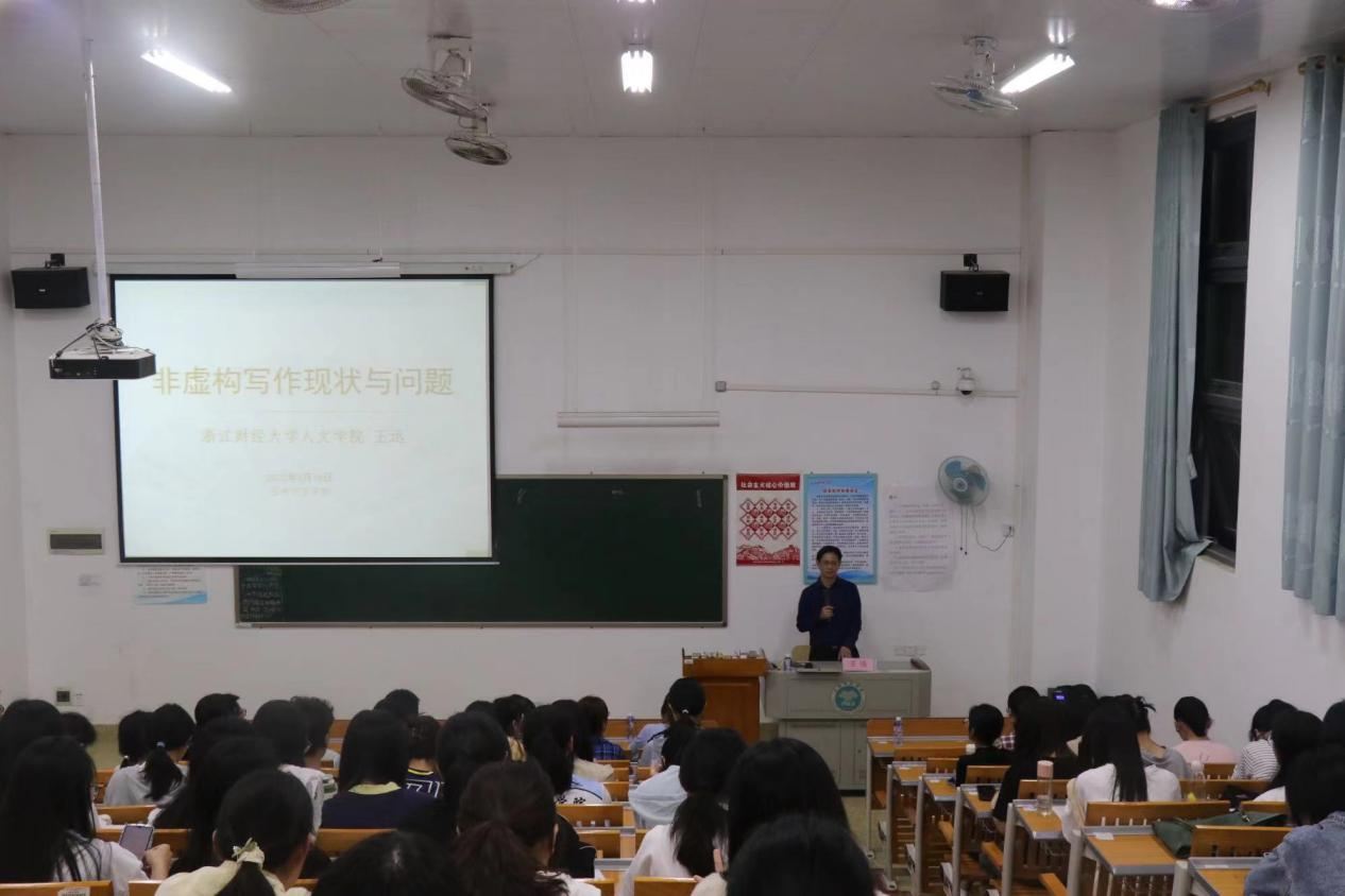 本站讯 3月19日晚,青年评论家、浙江财经大学人文学院副教授王迅博士应邀做客“博雅论坛”,为我院师生作了题为“非虚构写作现状与问题”的讲座。讲座由我院副院长郑立峰主持,卓越写作班校外导师李参天、我院教师陈彩林、赵娜、杨荷泉、梁航彬以及卓越写作班全体成员和我院学生代表参加。