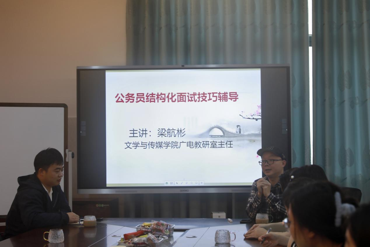 本站讯 4月4日下午,我院于至善楼6楼名师工作坊举行“问津”学术沙龙第四期讲座之“公务员(事业单位)结构化面试技巧辅导”。本次学术沙龙活动由我院辅导员夏恩强主持,我院广电教研室主任梁航彬担任主讲,我院科研秘书韦燕柳及学生代表到场参加。 讲座开始前,夏恩强首先向学生代表表示欢迎,向主讲嘉宾梁航彬和工作人员表示感谢,随后介绍了梁航彬的个人经历、成就及本次讲座的主题内容,要求同学们认真听讲、有所收获。