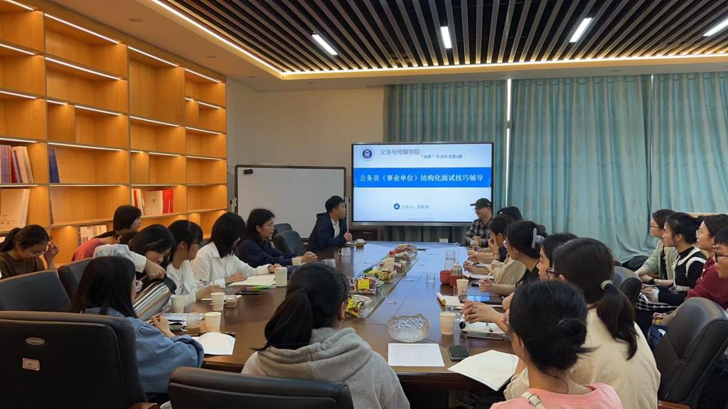 梁航彬强调同学们选择考公就一定要牢记为人民服务的宗旨,接着他以山东考公大军为切入口,分析了当下不同地区的考公形势,并结合自身和他人经历阐述了考公的重要性。随后,梁航彬从公务员考试相关知识、结构化面试的特点、结构化面试考察的内容、面试礼仪、答题思路、时间分配、题型分析等七个方面与在场学生代表交流分享。