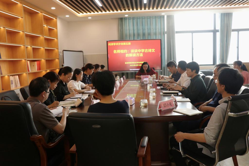 本站讯 5月16日下午,我院于至善楼6楼名师工作坊举行“问津”学术沙龙第五期讲座之“名师相约:谈谈中学古诗文的解读办法”。我院全体领导班子、玉林市初中语文名师杜萍、李寿娟、梁冰、苏学军、林燕及学生代表参加。本次活动由我院教授冯海英主持。