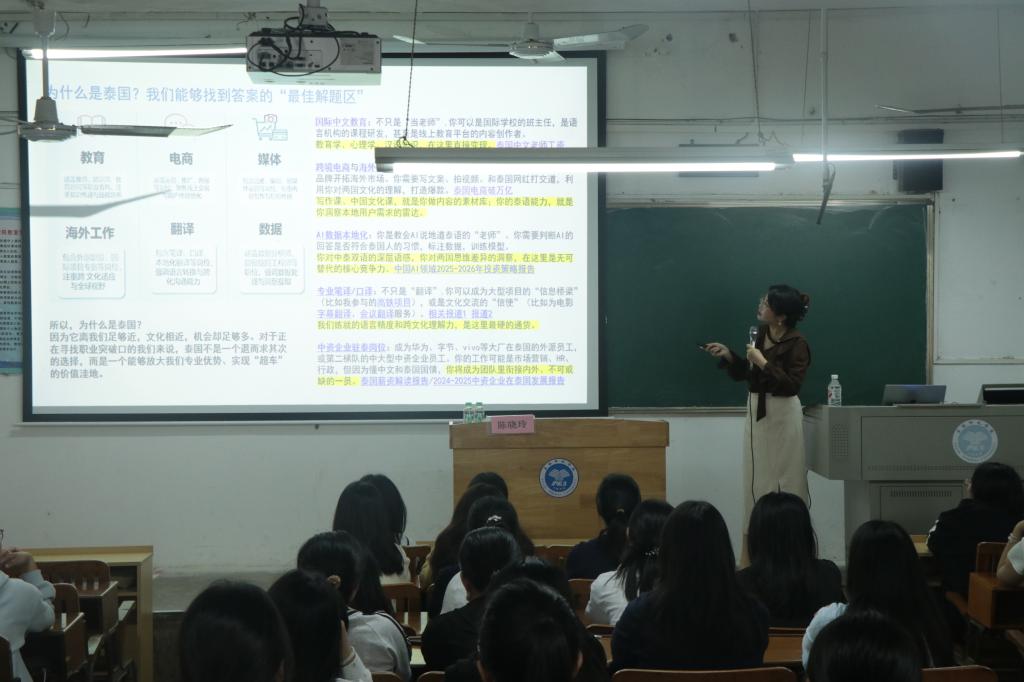 会上,陈晓玲以自身经历为切入点,讲述了她如何一步步走出自己的道路,实现自身价值。她提到,毕业后她曾就职于中铁二十五局、中航国际等国企海外公司,深度参与中泰铁路、通讯基站等重大基建项目的翻译与商务谈判工作,还曾为老挝总理担任临时翻译。2020年,她转型进入泰国电商领域,从销售做起,凭借专业能力和努力,实现单月销售额2000万泰铢的成绩,搭建了自己的直播团队,并成功打造化妆品新品牌。此外她提到,泰国中文教师薪资可观,中资企业外派岗位福利丰厚。汉语国际教育专业的语言优势、文化素养在跨境电商运营、高端翻译等岗位中极具竞争力。