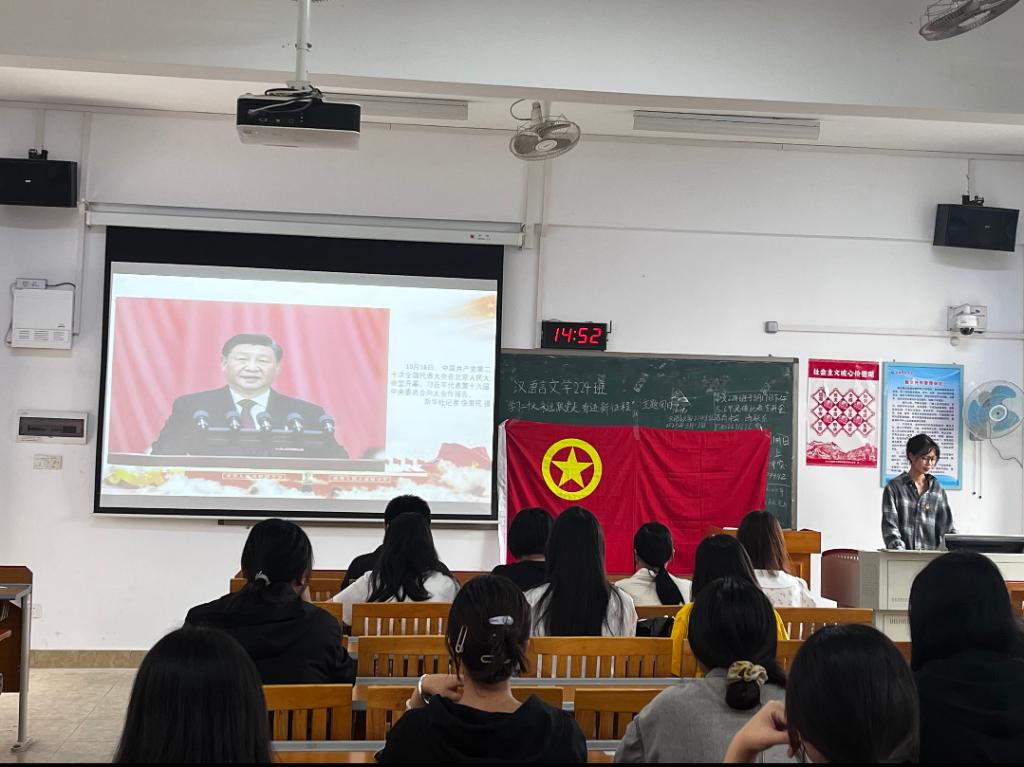 本站讯 为学习贯彻落实党的二十大精神,强化广大青年的政治品格,3月17日,我院汉语言文学224班于我校东校区至善楼204教室开展“学习二十大、永远跟党走、奋进新征程”主题团日活动。本次活动由该班组织委员潘姿颖主持,该班部分学生参与。