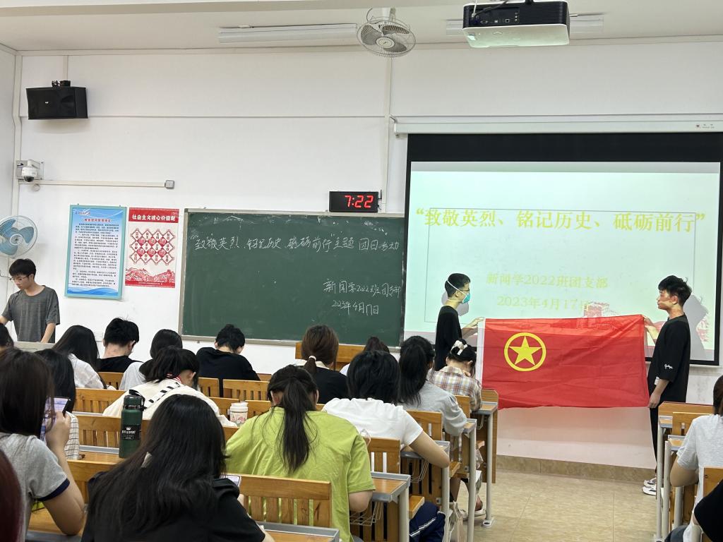 本站讯 为激发学生的爱国热情,增强历史使命感。4月17日早上,我院新闻学2022班于我校东校区至善楼201教室开展“致敬英烈、铭记历史、砥砺前行”主题团日活动。此次活动由该班班长韦燕飞主持,该班全体学生参加。