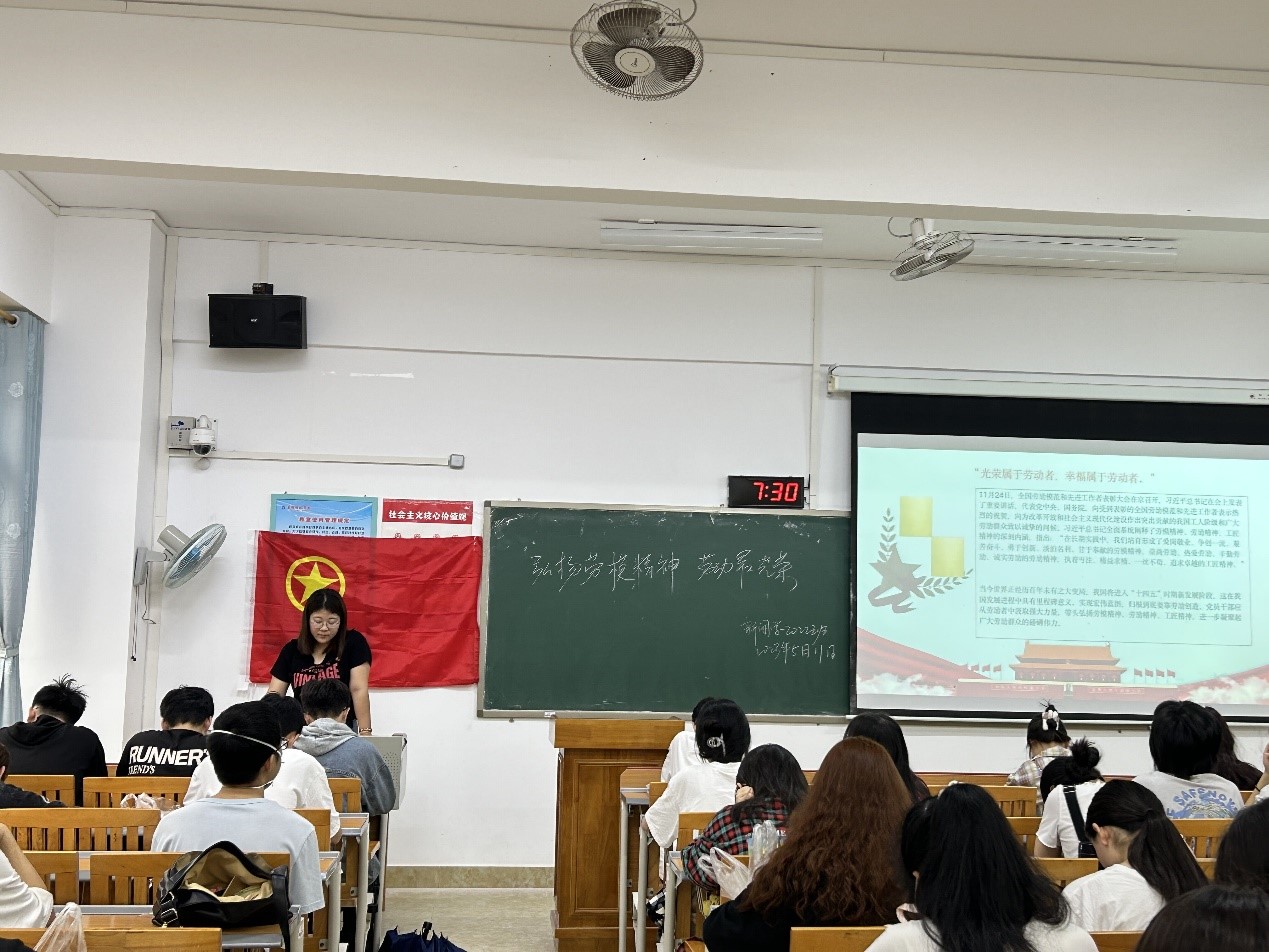 本站讯 为传承中华民族优秀的劳动观念,发展辛勤劳动、创造性劳动的新理念。5月11日早上,我院新闻学2022班于我校东校区至善201教室开展“弘扬劳模精神,劳动最光荣”主题团日活动。本次活动由该班团支书郭焱主持,该班全体学生参加。