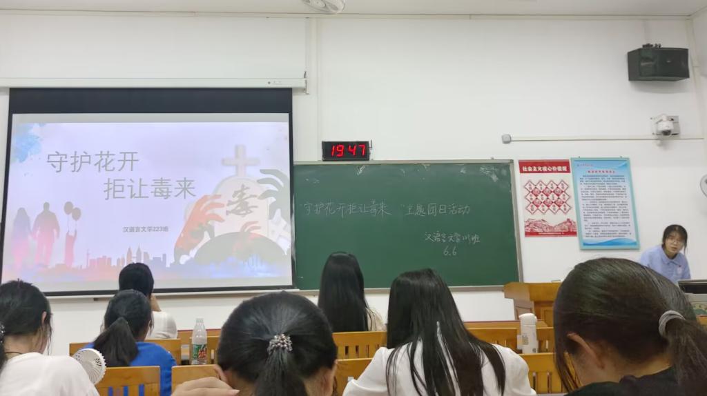 本站讯 为帮助同学们认识毒品的危害和进一步提高禁毒意识,增强识毒、防毒、拒毒能力,尊重生命,珍爱生命。6月6日晚,我院汉语言文学223班于我校东校区至善楼203教室开展“守护花开,拒让毒来”主题团日活动。本次团日活动由该班学生陈燕飞主持,该班全体学生参加。