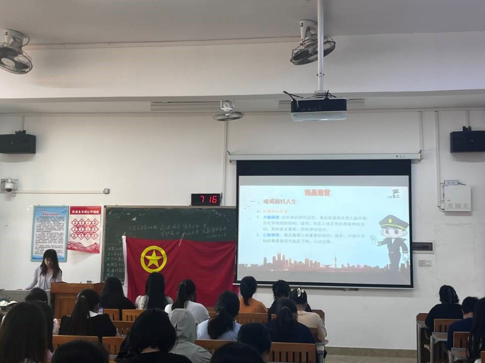 活动上,廖洋洋从“认识毒品”、“吸毒原因”、“毒品危害”、“毒品预防”四个方面展开阐述。接着,廖洋洋为学生科普了多种常见的毒品,如冰毒、海洛因、K粉等。这些毒品具有较强的隐蔽性和伪装性,令人防不胜防,极有可能在不经意间沾染上。随后,廖洋洋组织学生观看禁毒视频,帮助学生全面了解我国禁毒历史、禁毒概况、当前毒品形势、毒品的种类及危害等知识。最后,廖洋洋对本次活动进行总结,希望学生们能通过此次活动,树立远离毒品,珍爱生命的健康意识。