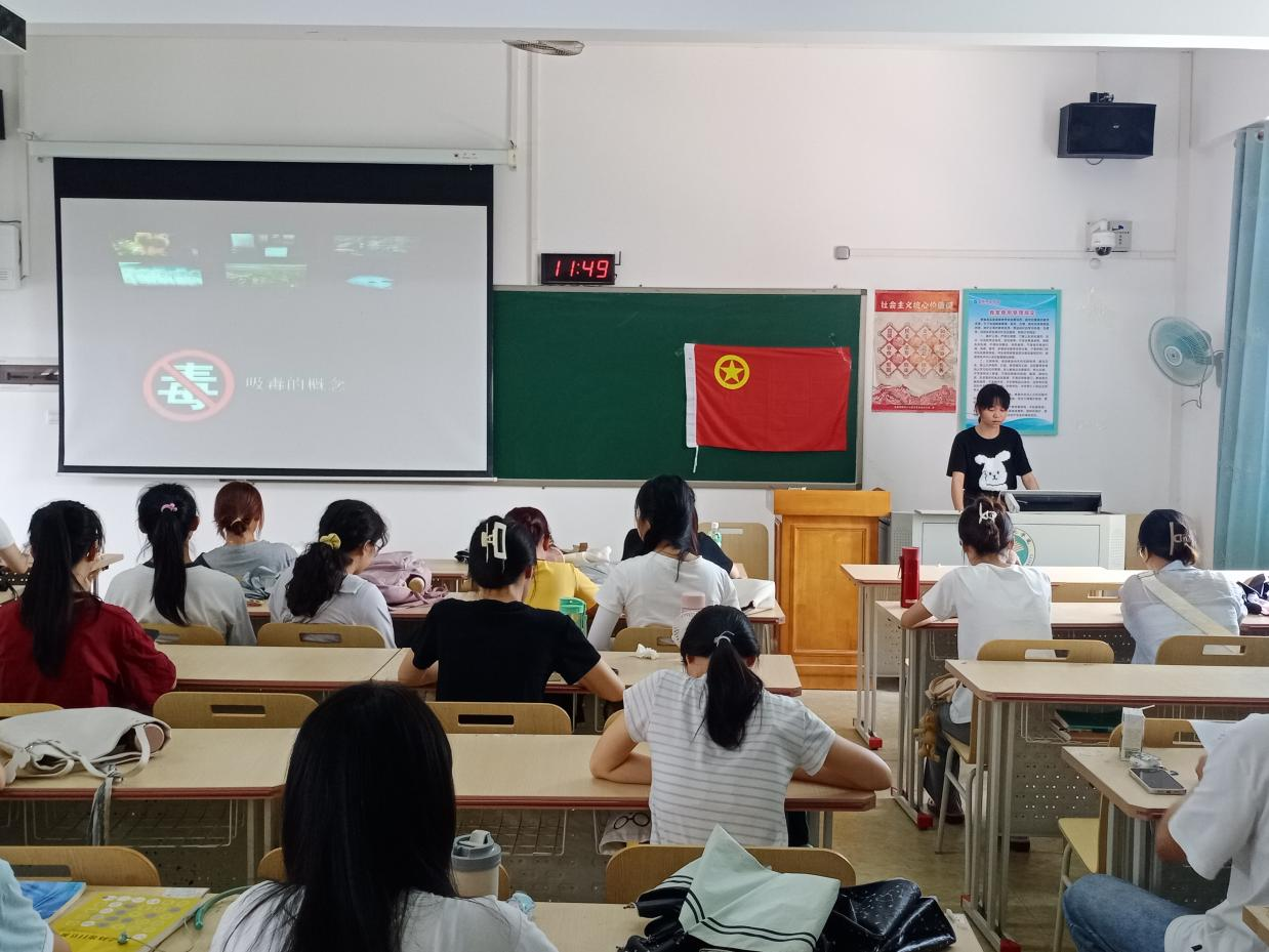 活动上,她首先向学生们解释毒品的含义、详细介绍毒品的种类。接着,她向学生们阐述吸毒的概念,还有吸毒的方式和吸毒的代价。此外,她还向学生们说明吸毒对身体、家庭和社会的危害,呼吁学生们认清毒品的危害,防患于未然。随后,她还给学生们提出了几个预防吸毒的措施。第一,学生们要接受毒品基本知识和禁毒法律法规教育,了解毒品的危害。第二,不结交有吸毒、贩毒行为的人,树立正确的人生观,不盲目追求享受。第三,不听信毒品能治病,毒品能解脱烦恼和痛苦,毒品能给人带来快乐等各种谣言。最后,她通过播放相关的禁毒短片,帮助学生们更直观地认识到毒品的危害,进一步让学生们拒绝诱惑,远离毒品。