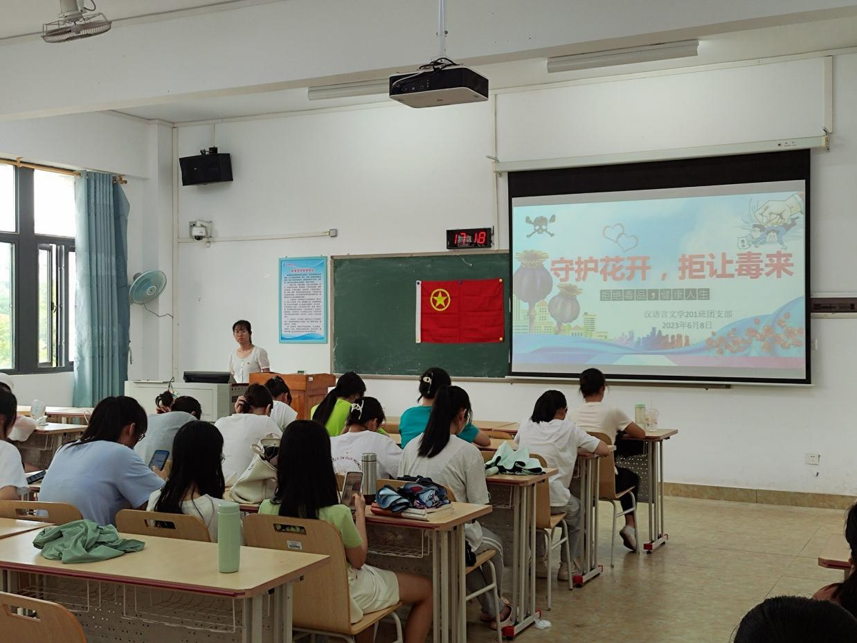 本站讯 为进一步提高团员们的禁毒意识和抵制毒品的能力,帮助团员们坚定禁毒信念,筑牢青春之盾,6月13日下午,汉语言文学201班团支部于我校东校区至善楼302教室开展“守护花开,拒让毒来”主题团日活动。本次活动由该班组织委员许文凤主持,该班全体成员参加。